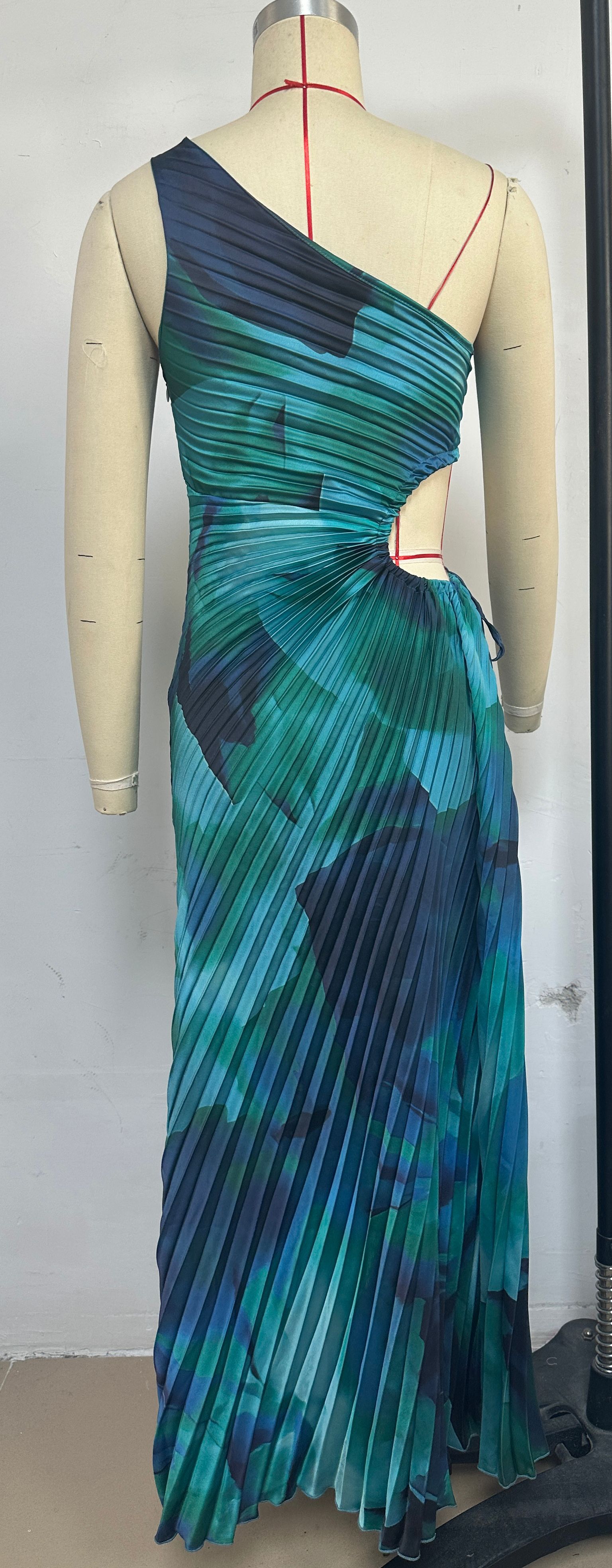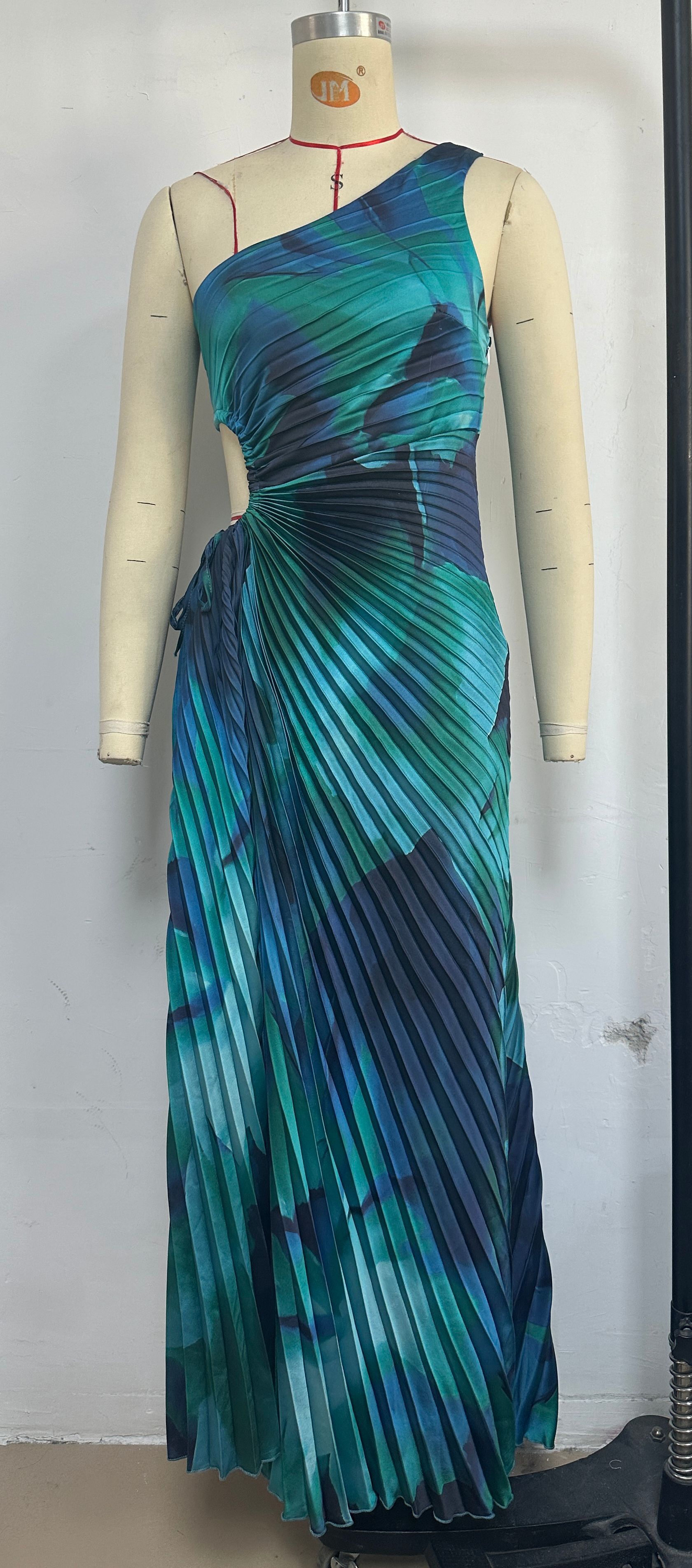 Vestido plisado con estampado de un solo hombro, sin mangas y oblicuo sexy